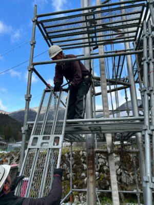 高さが11メートルくらいあるので足場部材をあげるのが1番の仕事ですね